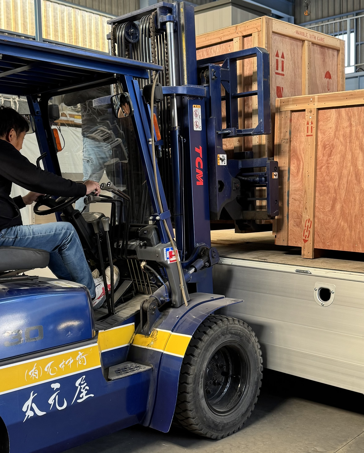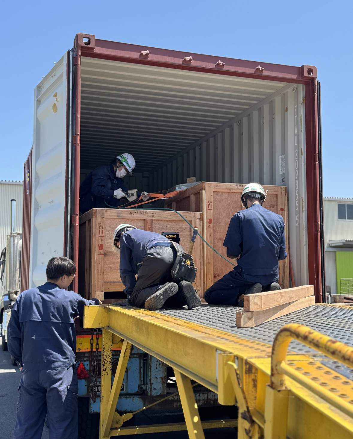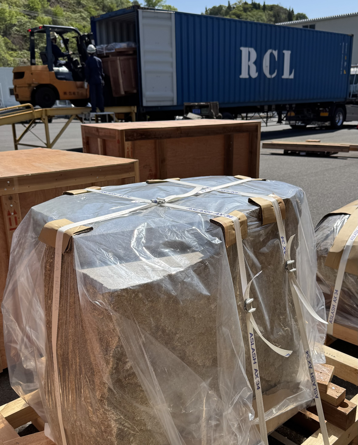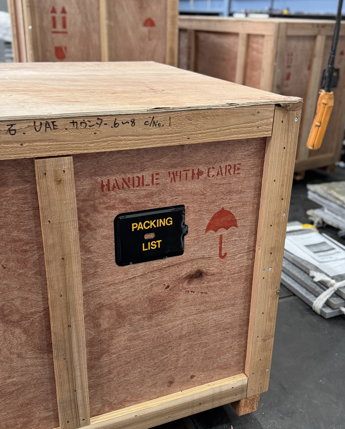 仕上がった加工部材、原石部材は、木箱やパレット梱包に分けられ、 丁寧な梱包がされ、輸出に必要なパッキングリスト等の書類作成、 完璧なバンニングリスト作成により、5時間で隙間なくコンテナに 積み込まれました。 総重量30トンの石材は、コンテナ2本(20フィート、40フィート)で 神戸港からUAEドバイ・ジュベルアリ港に約1ヶ月かけて到着しました。 現地の荷下ろしも注意を払ってくださり、一か所も破損することなく現地に 届けられました。
