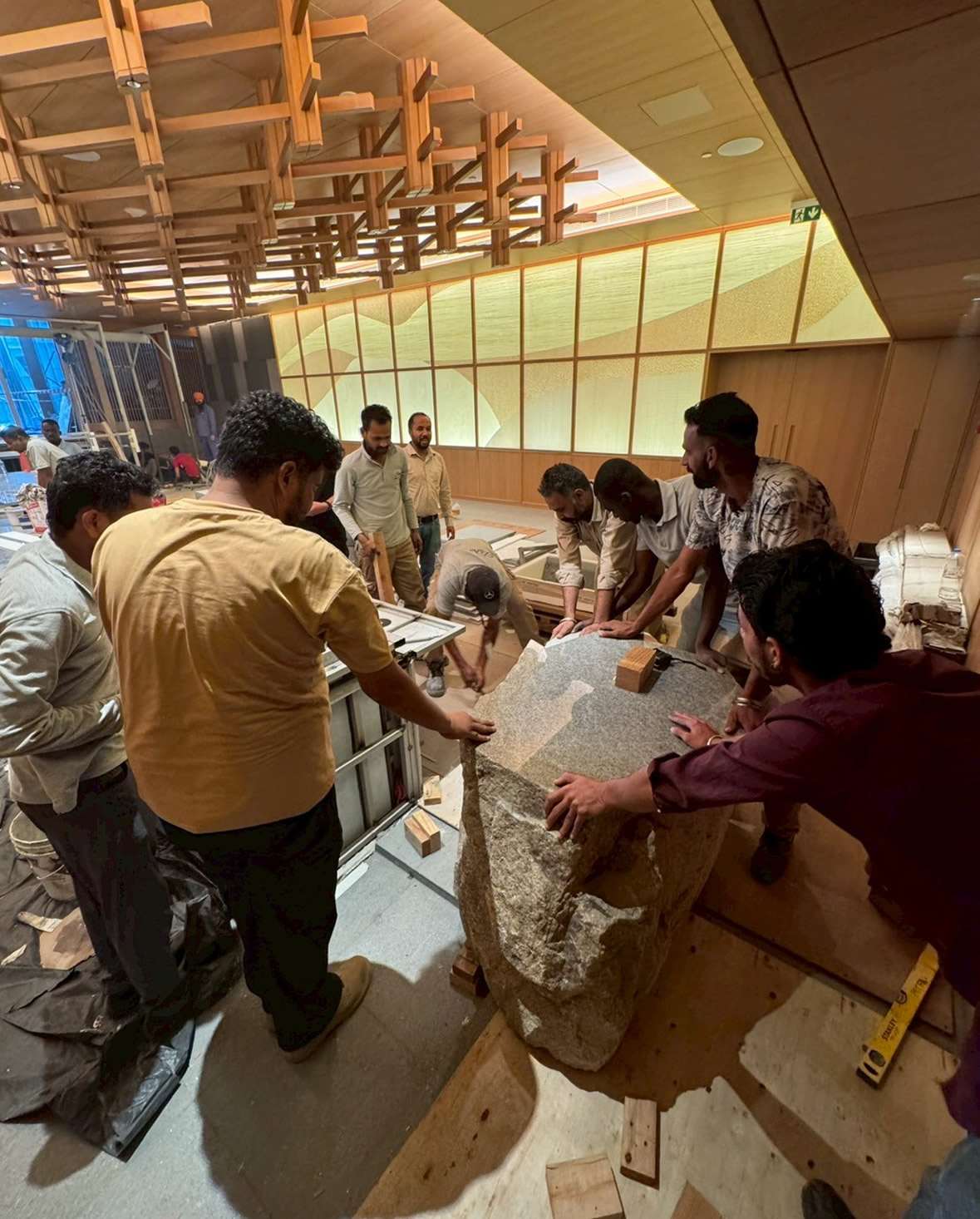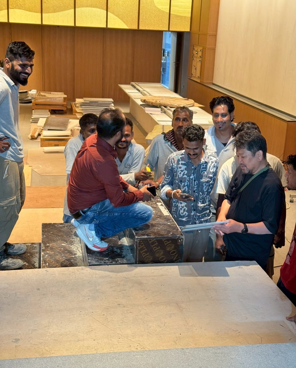 施工期間は約2週間。現地に向い現場に荷下ろしされた箱を開梱。 現地の石材業者と7か国から集められた職人たち。 言葉は通じなくても石の職人ということもあってチームワークよく、 スムーズに進めることが出来ました。