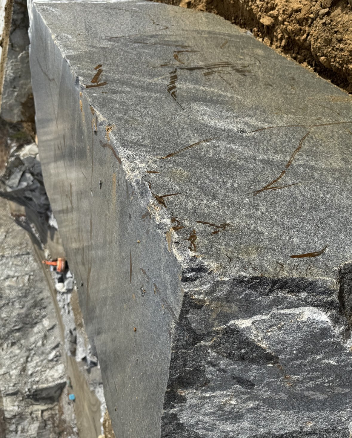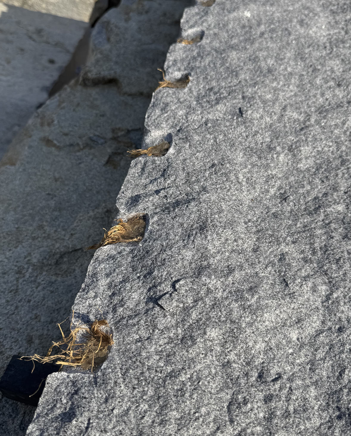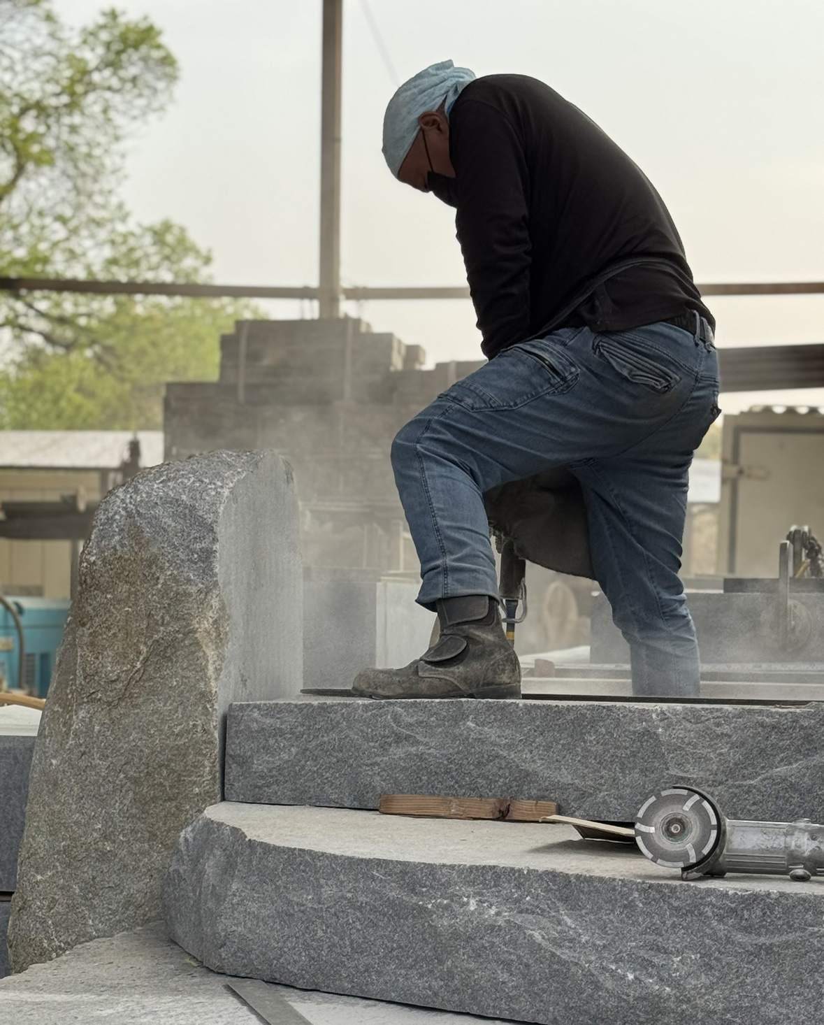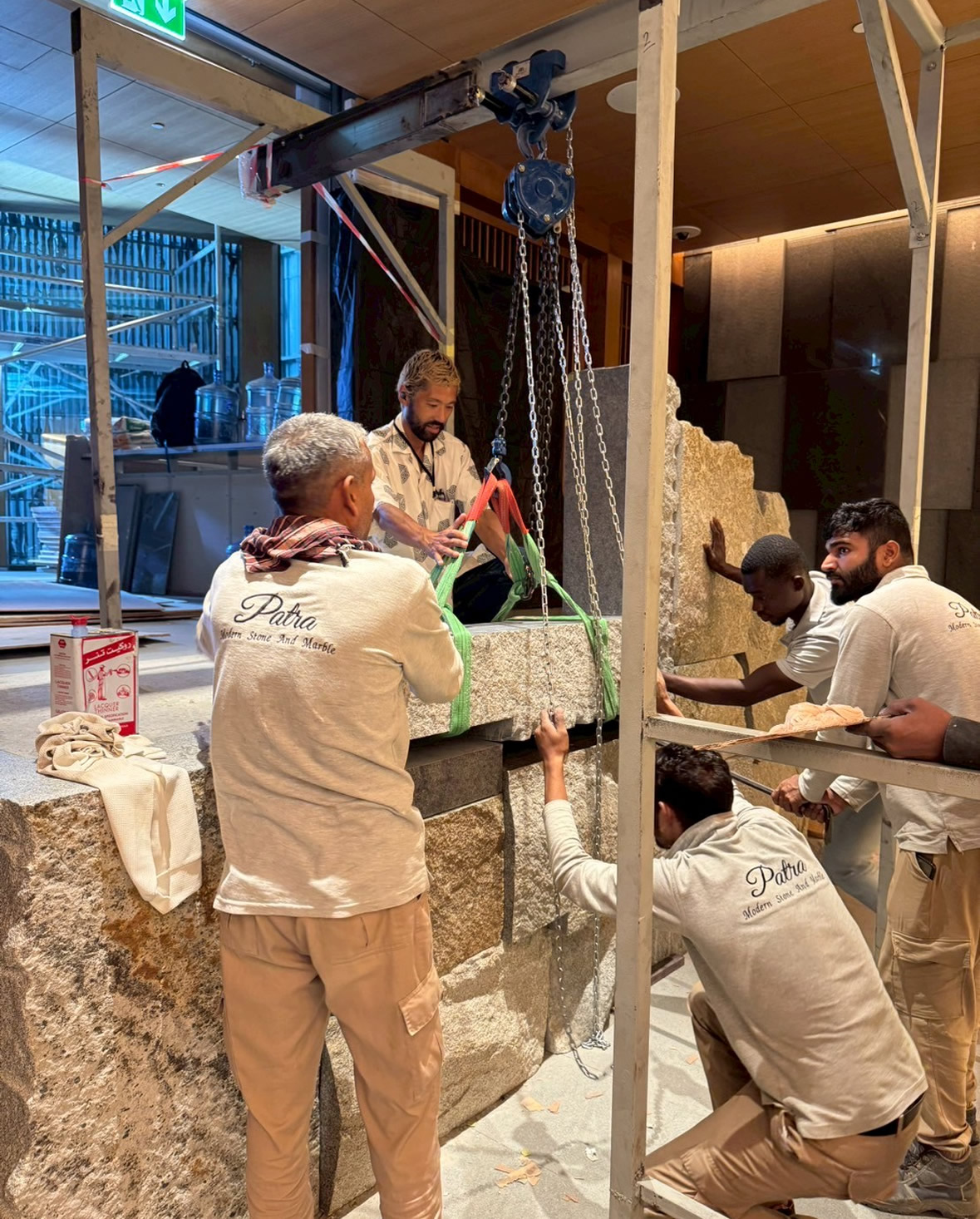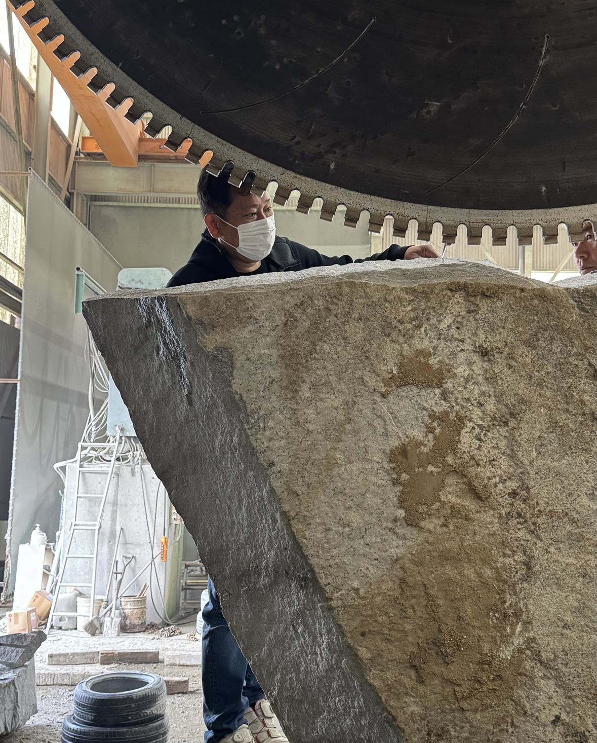 加工は石の目や模様が生きる切削方法、切削順を考えます。 特にひとつの石から全てのパーツを取るためには無駄な部分が 出ないように切削する見極めが必要です。 メインカウンターに続くテーブルは6m×4mの1枚石で周りに 自然に染み込んだ錆がまっているレア石で1枚切削する時間は 4時間かかり本磨き仕上しています。 壁、階段は現地で施工する前に仮組し、様々な加工方法や、サイズ、 色、形を組み合わせています。 出来る職人減ってきた飛び矢加工も機械で掘る丸矢加も建築材 として人気があり、アクセントになります。