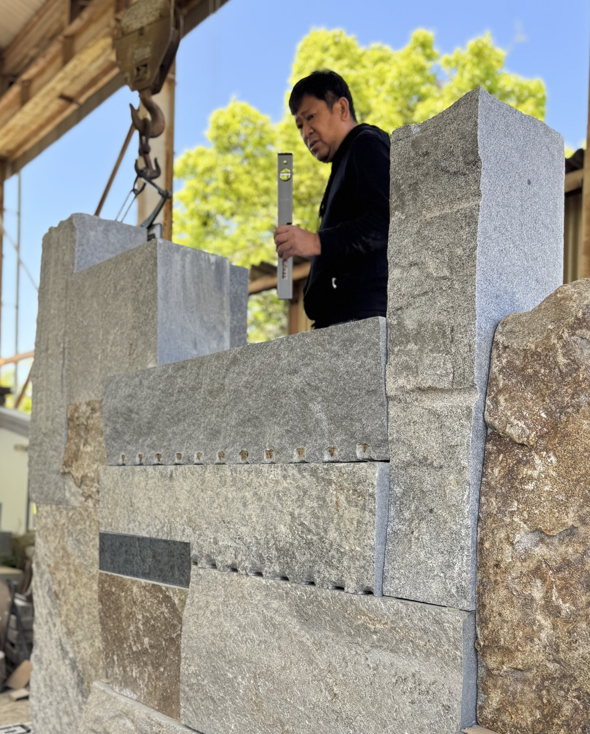 また、石壁、階段、景石、看板、飛び石は原石の風合いを生かし、庵治石材産地の加工技術を取り入れています。